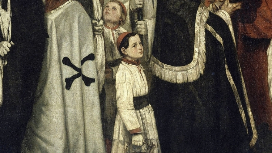 Beyaz giysili figürler, özellikle din görevlileri ve törensel rolleri olan kişileri temsil eder. Beyaz, burada saflıktan çok görev bilincini ve resmiyeti çağrıştırır.