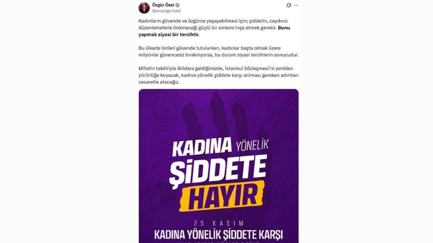 CHP Genel Başkanı Özgür Özel, 25 Kasım Kadına Yönelik Şiddete Karşı Uluslararası Mücadele Günü kapsamında sosyal medya hesabından dikkat çeken açıklamalarda bulundu.