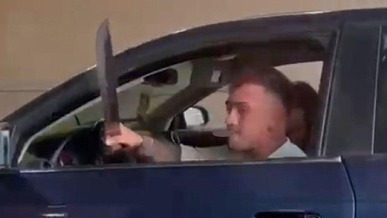 Görüntülerde sürücünün elindeki kılıcı savurması ve diğer araca zarar vermesi net şekilde görülüyor.