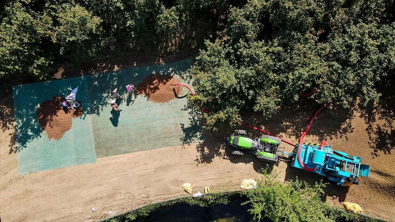 167 bin dekar dikili fındık arazisiyle fındık üretiminin önemli merkezlerinden Kocaali ilçesinde fındık toplamaya devam eden çiftçiler, kuruttukları ilk hasadı kabuğundan ayırmak için patoza vermeye başladı.