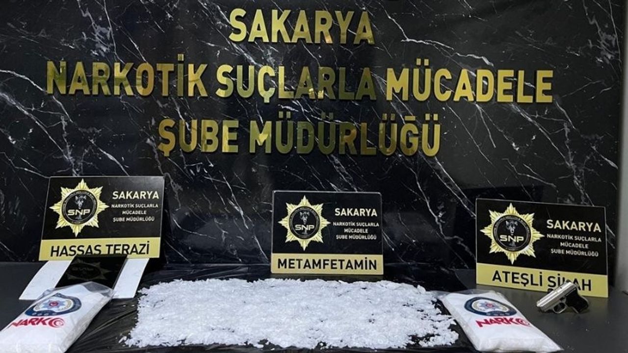 Şüphelilere ait 1 araç ve 2 ikamette yapılan aramalarda 3 kilo metamfetamin, 1 hassas terazi ve 1 ruhsatsız tabanca ele geçirildi.