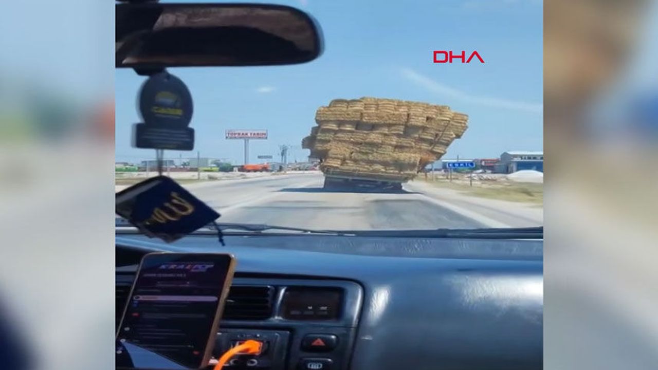 Aksaray'ın Eskil ilçesinde, saman balyası taşıyan aşırı yüklü bir kamyonun tehlikeli yolculuğu, çevredekilerin cep telefonuyla kaydedildi. Kamyonun sağ tarafa eğik bir şekilde seyir halinde olması, olası bir kazaya davetiye çıkarırken, bu anlar sosyal medyada büyük yankı uyandırdı.