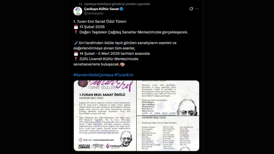 Çankaya Belediyesi tarafından hayata geçirilen Turan Erol Sanat Ödülleri’nin ilk töreni, 13 Şubat 2026 tarihinde Cuma günü Doğan Taşdelen Çağdaş Sanatlar Merkezi’nde yapılacak.