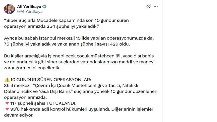 İçişleri Bakanı Ali Yerlikaya, siber suçlarla mücadele kapsamında 35 il merkezli son 10 günde operasyon düzenlendiğini duyurdu. Düzenlenen operasyonlarda yakalanarak gözaltına alınan 354 şüpheliden 117'si tutuklandı.