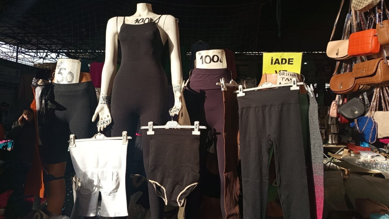 Sıhhiye Sosyete Pazarı’nda ev giyimi reyonları bu hafta da yoğun ilgi gördü. Tayt ve fitilli tulumlar 100 TL seviyesinde satışa sunulurken, özellikle genç ziyaretçiler ve ev rahatlığına önem verenler için cazip bir seçenek oluşturdu.