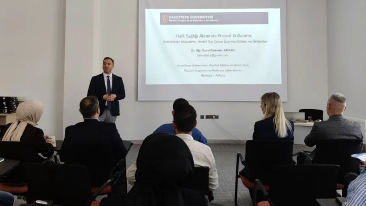 Hacettepe Üniversitesi Öğretim Üyesi Dr. Kalender Arıkan’ın anlatımıyla gerçekleşen eğitimde, modern ilaçlama teknikleri ve vektörle mücadele stratejileri işlendi. Programın ilk dersinde saha operasyonlarında görev alan personele, ilaçlamanın teknik boyutları hakkında bilgiler verildi. Vektör türlerinin özellikleri ve bu türlerle mücadele ederken dikkat edilmesi gereken aşamalar uygulamalı örneklerle katılımcılara aktarıldı.
