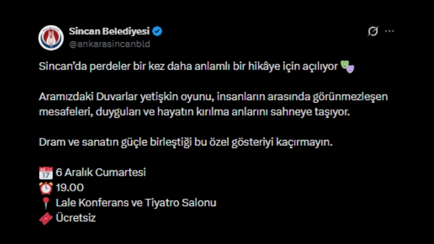Sincan Belediyesi paylaşımının devamında “Dram ve sanatın güçle birleştiği bu özel gösteriyi kaçırmayın” diyerek tüm halkı davet etti.