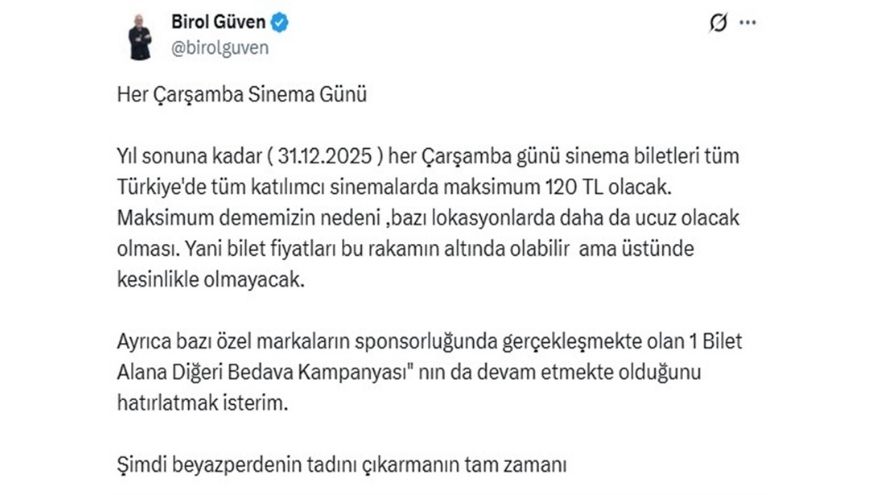 Güven, sosyal medya hesabından yaptığı paylaşımda, "Yıl sonuna kadar (31 Aralık 2025) her çarşamba günü sinema biletleri tüm Türkiye'de, tüm katılımcı sinemalarda maksimum 120 TL olacak. Maksimum dememizin nedeni bazı lokasyonlarda daha da ucuz olacak olması. Yani bilet fiyatları bu rakamın altında olabilir ama üstünde kesinlikle olmayacak. Ayrıca bazı özel markaların sponsorluğunda gerçekleşmekte olan '1 Bilet Alana Diğeri Bedava Kampanyası'nın da devam etmekte olduğunu hatırlatmak isterim. Şimdi beyaz perdenin tadını çıkarmanın tam zamanı" ifadelerini kullandı.