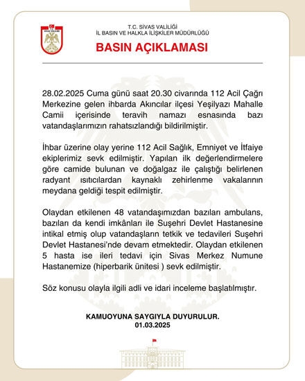“28 Şubat Cuma günü saat 20.30 sıralarında 112 Acil Çağrı Merkezi’ne gelen ihbarda, Akıncılar ilçesi Yeşilyazı Mahalle Camisi'nde teravih namazı sırasında bazı vatandaşlarımızın rahatsızlandığı bildirilmiştir. Yapılan ilk incelemelerde, camide kullanılan doğal gazlı radyant ısıtıcıdan sızan gaz nedeniyle zehirlenme vakalarının meydana geldiği belirlenmiştir.”