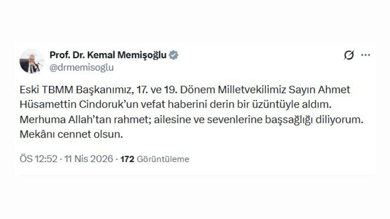 "Türk siyasetinin müstesna ismi, TBMM Başkanlığı ve vekaleten Cumhurbaşkanlığı görevlerinde bulunmuş Hüsamettin Cindoruk’un vefatını derin bir üzüntüyle öğrendim. Bir ömrü hukuka, Meclis’in itibarına ve demokratik siyaset geleneğine adayan Sayın Cindoruk; makamların ağırlığını, emaneti taşımasını ve zamanı gelince devretmesini bilen bir devlet adamıydı. Genç yaşta hukukçu olarak başladığı yolculukta, darbe dönemlerinin gölgesine rağmen demokratik meşruiyetten yana duruş sergilemesi, hayatındaki en kıymetli izlerden biri olarak hatırlanacaktır. Mekanı cennet olsun."