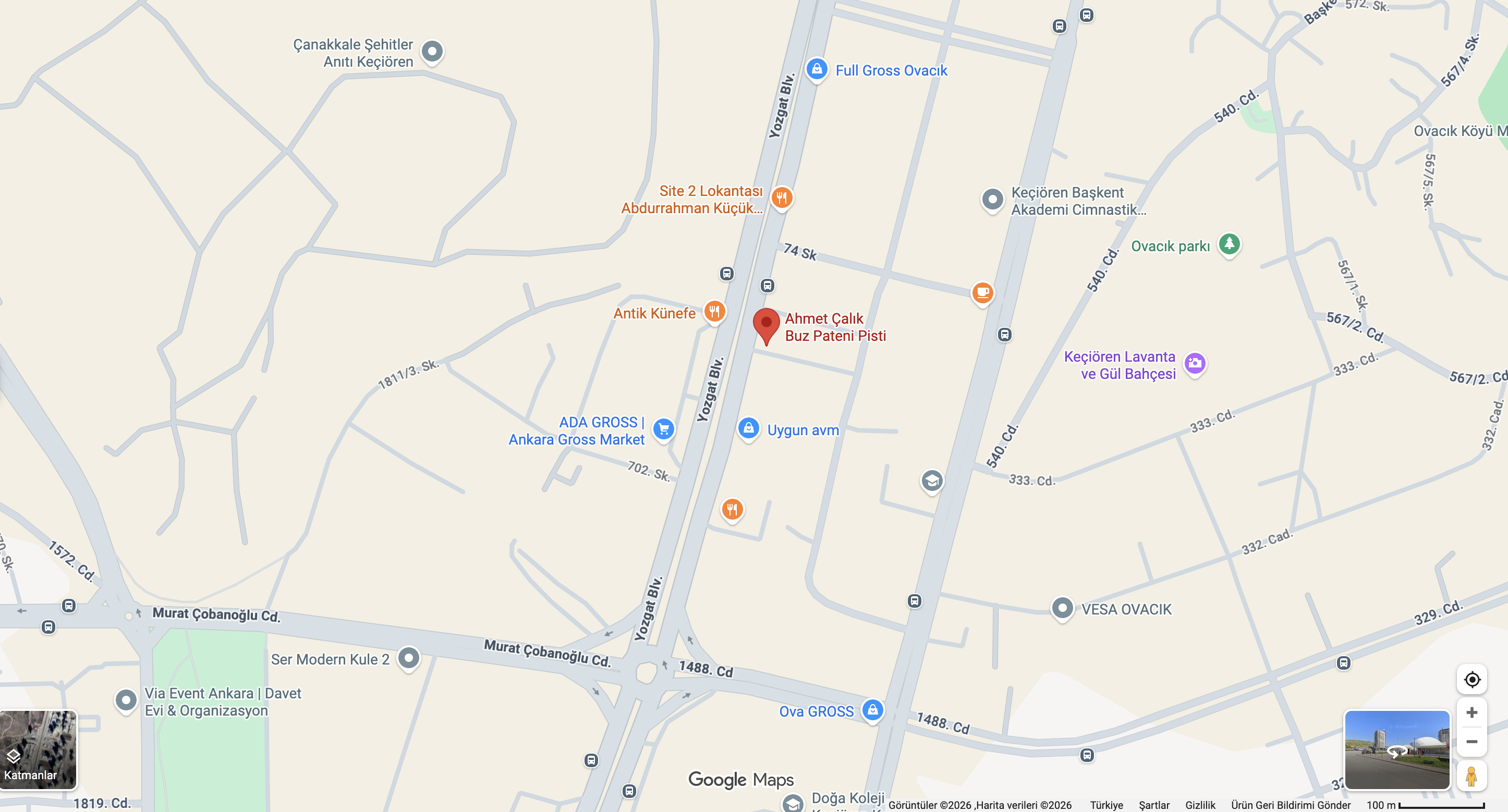 Etlik Caddesi üzerinden devam ederek Yozgat Bulvarı'na bağlanın. Bulvar üzerinde ilerlerken Ovacık mevkisinde sağ tarafta Ahmet Çalık Buz Pateni Pisti'ni göreceksiniz.