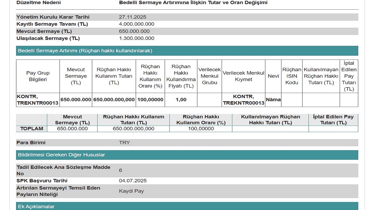 Kontrolmatik Teknoloji Enerji ve Mühendislik A.Ş.'nin ödenmiş sermayesi güncel olarak 650 milyon TL seviyesinde bulunuyor. Şirket, bu rakamı aynı seviyede artırarak 1,3 milyar lira noktasına çıkarmayı amaçlıyor. SPK'dan gelen onayla birlikte yüzde 100 oranında bedelli sermaye artırımı kapsamında, hali hazırda şirkette payı olanlar için pay alma hakkı tanınacak.