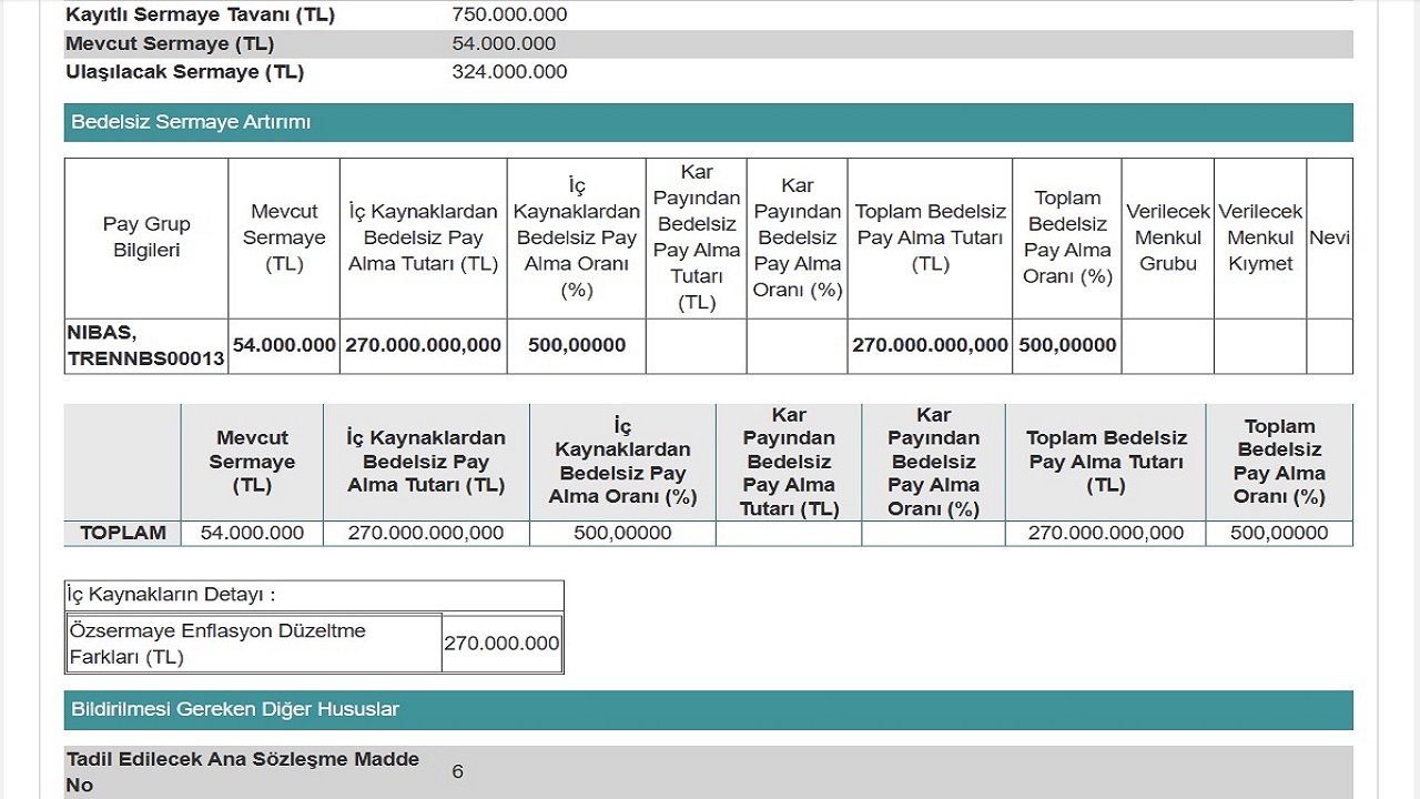 Niğbaş Niğde Beton Sanayi ve Ticaret A.Ş.'nin sermayesi hali hazırda 54 milyon lira düzeyinde bulunuyor. Şirket, söz konusu rakamı iç kaynaklardan 270 milyon lira artırma kararı aldı. Bu karar kapsamında, şirketin yeni sermayesi 324 milyon liraya çıkacak. 270 milyon liralık sermaye artırım meblağı; 'özsermaye enflasyon düzeltme farkları' kaleminden karşılanacak.