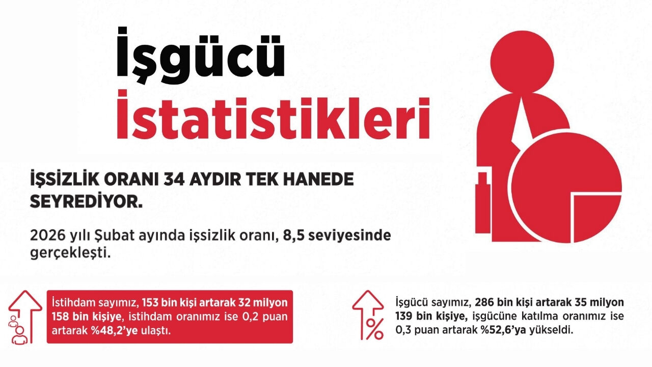 Bakan Işıkhan, açıklamasında geleceğe yönelik beklentilere de değindi ve "2026 yılı Şubat ayında işsizlik oranı 8,5 seviyesinde gerçekleşti. İş gücü sayımız, şubat ayında bir önceki aya göre 286 bin kişi artarak 35 milyon 139 bin kişiye, iş gücüne katılma oranımız ise 0,3 puan artarak yüzde 52,6’ya yükseldi. İş gücü piyasalarımız güçlendikçe istihdam kapasitemiz artmayı sürdürüyor. İstihdam sayımız, aynı dönemde 153 bin kişi artarak 32 milyon 158 bin kişiye, istihdam oranımız ise 0,2 puan artarak yüzde 48,2’ye ulaştı. Önümüzdeki süreçte hem işsizlik oranında hem de istihdamda daha iyi seviyelere ulaşacak, hedeflerimizi gerçekleştireceğiz" ifadelerini kullandı.