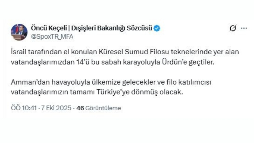 Dışişleri Sözcüsü Öncü Keçeli, "İsrail tarafından el konulan Küresel Sumud Filosu teknelerinde yer alan vatandaşlarımızdan 14'ü bu sabah kara yoluyla Ürdün'e geçtiler. Amman'dan hava yoluyla ülkemize gelecekler ve filo katılımcısı vatandaşlarımızın tamamı Türkiye'ye dönmüş olacak" şeklinde açıklama yaptı.