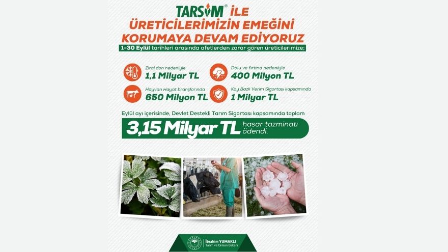 Yumaklı, “Doğal afetler ve riskler karşısında üreticimizin emeğini koruyoruz. Eylül ayında Devlet Destekli Tarım Sigortası kapsamında üreticilerimize 3 milyar 150 milyon TL hasar tazminatı ödedik” ifadelerini kullandı.