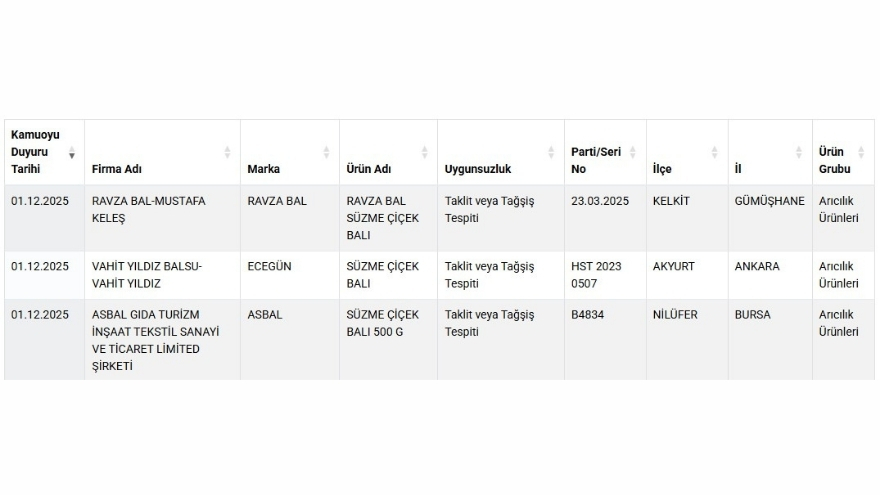 Yetkililer, gıda güvenliğinin korunması için listenin düzenli olarak güncellendiğini hatırlatarak tüketicilerin özellikle bal, yağ, süt ürünleri gibi riskli kategorilerde bakanlığın paylaşımlarını takip etmelerini öneriyor.