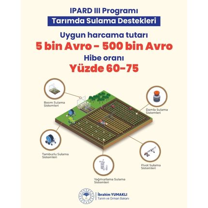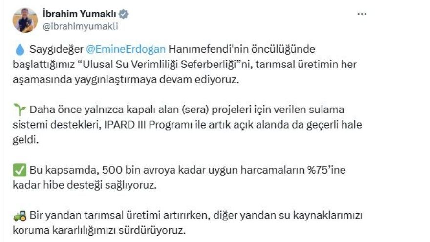 Bakan Yumaklı sosyal medya hesabından yaptığı açıklamada, "Saygıdeğer Emine Erdoğan Hanımefendi'nin öncülüğünde başlattığımız 'Ulusal Su Verimliliği Seferberliği'ni, tarımsal üretimin her aşamasında yaygınlaştırmaya devam ediyoruz. Daha önce yalnızca kapalı alan (sera) projeleri için verilen sulama sistemi destekleri, IPARD 3 Programı ile artık açık alanda da geçerli hale geldi’’ dedi.
