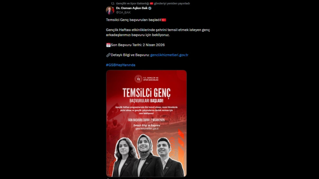 Gençlik ve Spor Bakanı Osman Aşkın Bak, sosyal medya hesabından yaptığı açıklamada, Temsilci Genç başvurularının başladığını duyurdu. Bakan Bak, “Temsilci Genç başvuruları başladı! Gençlik Haftası etkinliklerinde şehrini temsil etmek isteyen genç arkadaşlarımızı başvuru için bekliyoruz” ifadelerini kullanarak gençleri programa katılmaya davet etti.