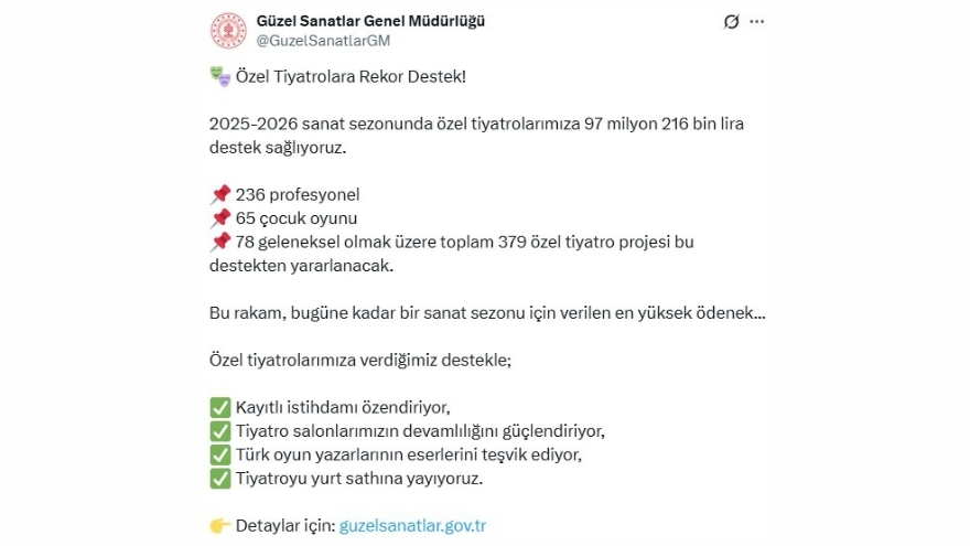 Güzel Sanatlar Genel Müdürlüğü sosyal medya hesabından yaptığı açıklamada, “2025-2026 sanat sezonunda özel tiyatrolarımıza 97 milyon 216 bin lira destek sağlıyoruz. 236 profesyonel, 65 çocuk oyunu, 78 geleneksel olmak üzere toplam 379 özel tiyatro projesi bu destekten yararlanacak. Bu rakam, bugüne kadar bir sanat sezonu için verilen en yüksek ödenek. Özel tiyatrolarımıza verdiğimiz destekle; kayıtlı istihdamı özendiriyor, tiyatro salonlarımızın devamlılığını güçlendiriyor, Türk oyun yazarlarının eserlerini teşvik ediyor, tiyatroyu yurt sathına yayıyoruz” ifadelerine yer verildi.