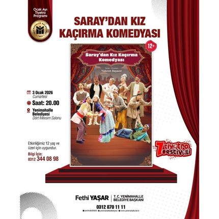 Saraydan Kız Kaçırma Komedyası isimli tiyatro oyununun tarihi, 3 Ocak 2026 Cumartesi günü olarak takvimlerdeki yerini aldı. Oyun, Yenimahalle Belediyesi Dört Mevsim Tiyatro Salonu’nda akşam saat 20.00’de sahne ışıklarıyla buluşacak.