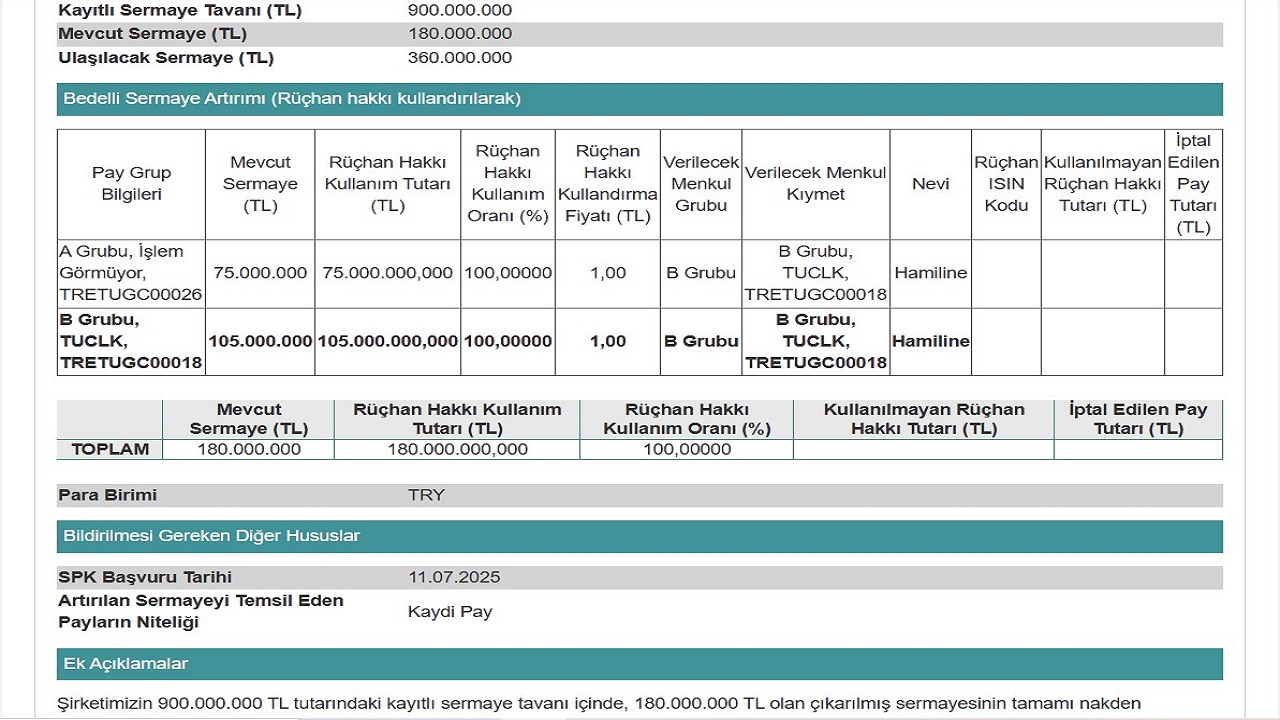 Şirket, bedelli sermaye artırımı dolayısıyla rüçhan hakkı kullanım sürecinin ne zaman başlayacağını KAP sayfası üzerinden deklare edecek. 15 günlük sürenin Aralık ayı içerisinde başlayıp bitmesi ve 2026 yılı öncesinde TUCLK hissenin bölünmesi bekleniyor.