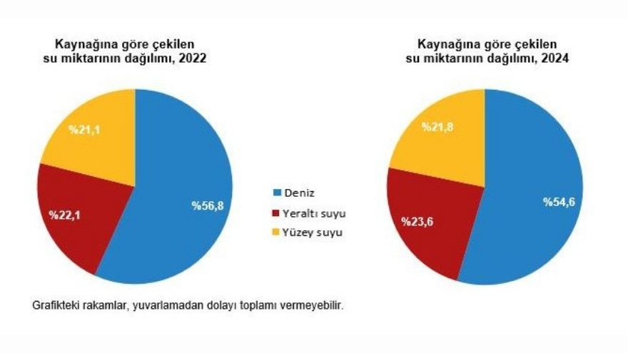 2024 yılında çekilen suyun yüzde 54,6’sı denizlerden, kalan yüzde 45,4’lük kısmı ise tatlı su kaynaklarından sağlandı. Tatlı suyun yüzde 81’i belediyeler tarafından temin edilirken, sanayi ve diğer kurumların payı daha düşük kaldı.