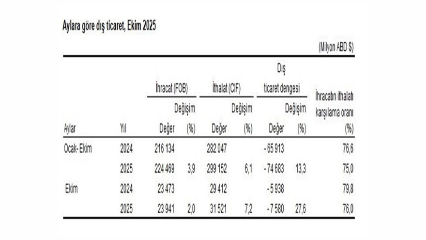 Ocak–Ekim dönemine bakıldığında ihracat yüzde 3,9 artışla 224 milyar 469 milyon dolara, ithalat ise yüzde 6,1 yükselişle 299 milyar 152 milyon dolara ulaştı.