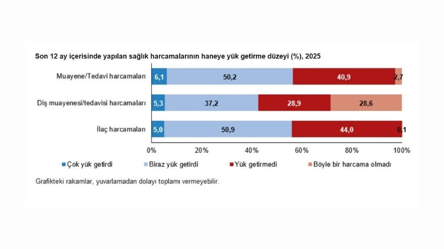 Türkiye İstatistik Kurumu’na (TÜİK) göre, doktor muayene ve tedavi harcamaları hanelerin yüzde 6,1’ine çok, yüzde 50,2’sine biraz yük getirdi, yüzde 40,9’una ise yük getirmedi. Diş muayene ve tedavi harcamaları yüzde 5,3’e çok, yüzde 37,2’ye biraz yük oluştururken yüzde 28,9’u etkilenmedi. İlaç harcamaları ise hanelerin yüzde 5’inde çok, yüzde 50,9’unda biraz yük oluşturdu, yüzde 44’ü yük hissetmedi.
