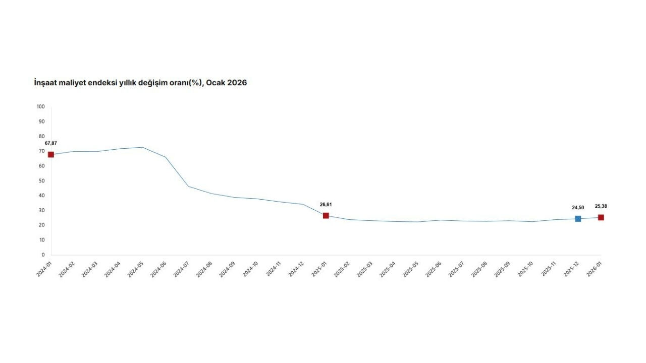 Türkiye İstatistik Kurumu (TÜİK) verilerine göre ocak ayında inşaat maliyetleri hızla yükseldi. Endeks bir önceki aya göre yüzde 9,87 artarken, yıllık artış yüzde 25,38 olarak kaydedildi. Malzeme ve işçilik maliyetleri hem aylık hem yıllık bazda yükseliş gösterdi. Bina ve bina dışı yapılar için maliyet artışları da farklı seviyelerde gerçekleşti.