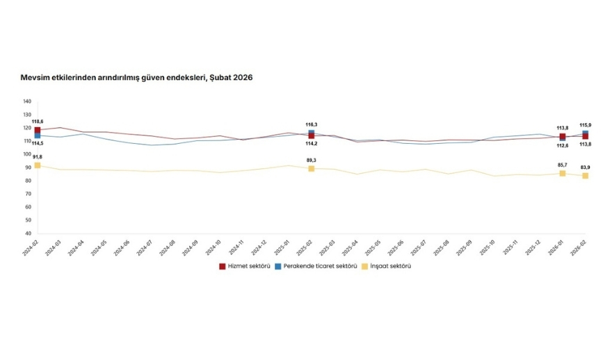TÜİK tarafından açıklanan Şubat 2026 dönemine ilişkin verilere göre, mevsim etkilerinden arındırılmış hizmet sektörü güven endeksi bir önceki aya göre değişim göstermedi. Endeks 113,8 seviyesinde kaldı. Bu tablo, sektörde mevcut beklenti ve faaliyet görünümünün korunmaya devam ettiğini ortaya koydu.