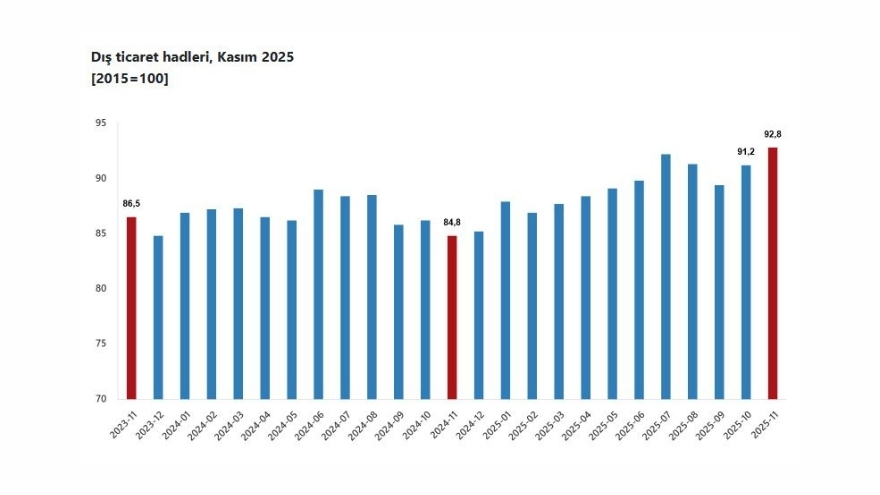 İhracat birim değer endeksinin ithalat birim değer endeksine oranlanmasıyla hesaplanan dış ticaret haddi, kasım ayında geçen yılın aynı dönemine göre 8 puan artarak 92,8 seviyesine ulaştı.