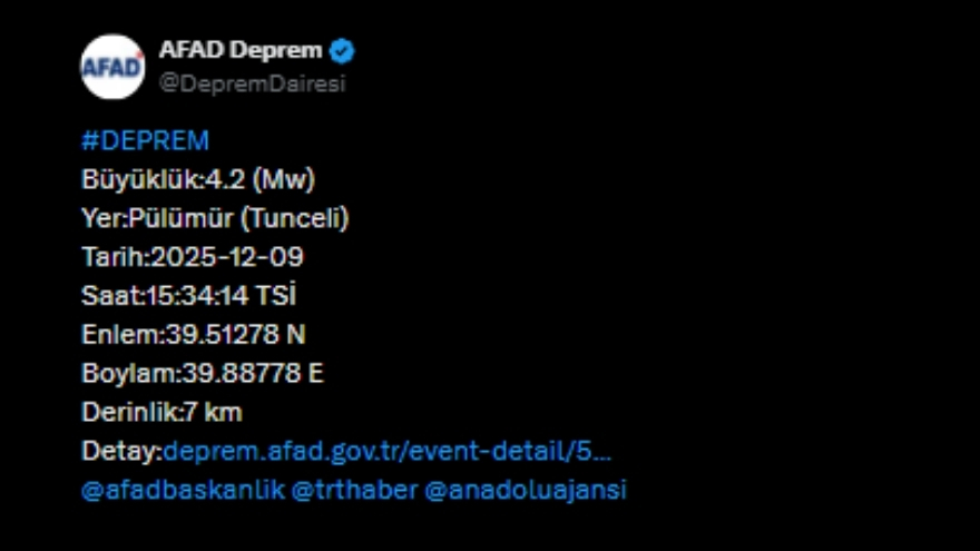 Tunceli’de öğleden sonra meydana gelen deprem kentte kısa süreli endişeye neden oldu. Pülümür merkezli 4.2 büyüklüğündeki sarsıntı, çevredeki yerleşim yerlerinde de hissedilirken, ilk belirlemelere göre herhangi bir olumsuzluk yaşanmadı.