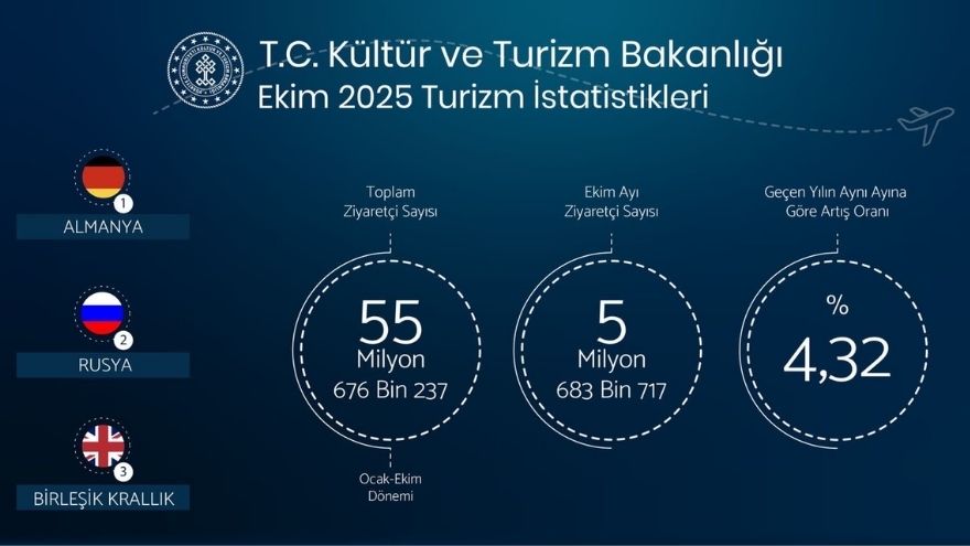 2025 yılının Ocak-Ekim dönemine ilişkin toplam veriler de dikkat çekici. İlk 10 ayda Türkiye’ye gelen toplam ziyaretçi sayısı 55 milyon 676 bin 237 olurken, bu sayının 47 milyon 252 bin 314’ü yabancı turistlerden oluştu. Geri kalan kısım ise yurt dışında yaşayan Türk vatandaşlarından meydana geldi.