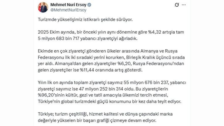 Bakan Ersoy, açıklamasında “Turizmde yükselişimiz istikrarlı şekilde sürüyor. 2025 Ekim ayında, bir önceki yılın aynı dönemine göre yüzde 4,32 artışla tam 5 milyon 683 bin 717 yabancı ziyaretçiyi ağırladık. Bu ziyaretçilerin yüzde 96,20'sinin kültür, gezi ve tatil amacıyla ülkemizi tercih etmesi, Türkiye'nin global turizmdeki güçlü konumunu bir kez daha teyit ediyor. Türkiye; turizm çeşitliliği, hizmet kalitesi ve dünya çapındaki marka değeriyle yükselen bir başarı grafiği çizmeye devam ediyor” ifadelerini kullandı.
