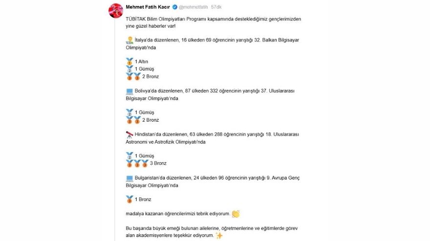 Bakan Kacır’ın paylaştığı verilere göre Türk öğrenciler, bu yıl dört farklı ülkede düzenlenen uluslararası bilim olimpiyatlarında dikkat çekici başarılara imza attı. İtalya’da 16 ülke ve 69 öğrencinin katılımıyla gerçekleştirilen 32’nci Balkan Bilgisayar Olimpiyatı’nda Türkiye ekibi 1 altın, 1 gümüş ve 2 bronz madalya kazandı.
