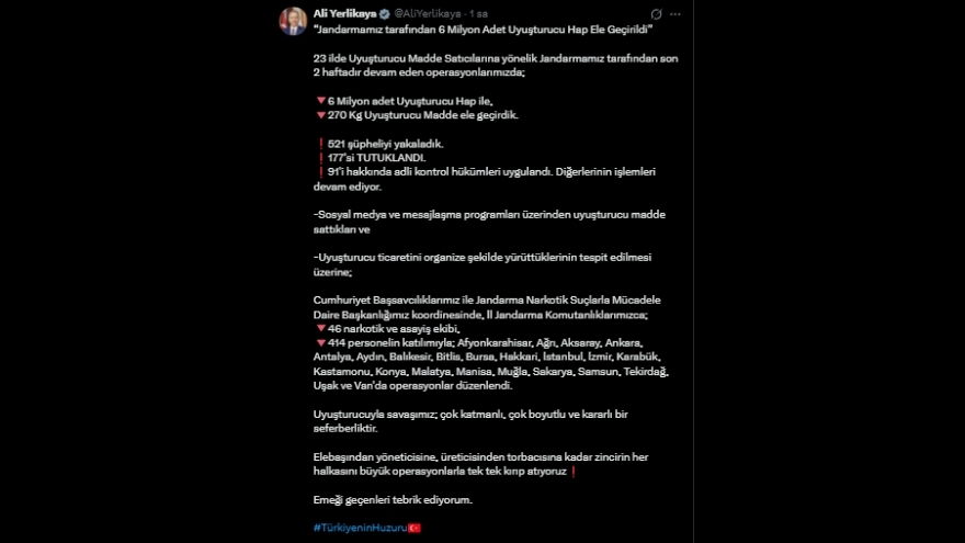 “Cumhuriyet Başsavcılıklarımız ile Jandarma Narkotik Suçlarla Mücadele Daire Başkanlığımız koordinesinde, İl Jandarma Komutanlıklarımızca; 46 narkotik ve asayiş ekibi, 414 personelin katılımıyla; Afyonkarahisar, Ağrı, Aksaray, Ankara, Antalya, Aydın, Balıkesir, Bitlis, Bursa, Hakkari, İstanbul, İzmir, Karabük, Kastamonu, Konya, Malatya, Manisa, Muğla, Sakarya, Samsun, Tekirdağ, Uşak ve Van'da operasyonlar düzenlendi. Uyuşturucuyla savaşımız; çok katmanlı, çok boyutlu ve kararlı bir seferberliktir. Elebaşından yöneticisine, üreticisinden torbacısına kadar zincirin her halkasını büyük operasyonlarla tek tek kırıp atıyoruz. Emeği geçenleri tebrik ediyorum.”