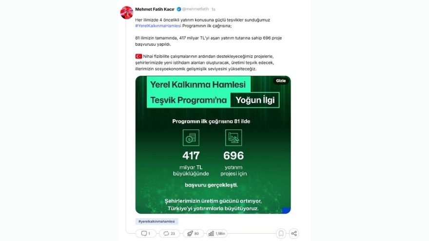 Bakan Kacır, sosyal medya hesabından yaptığı açıklamada, “Yerel Kalkınma Hamlesi Programı'nın ilk çağrısına; 81 ilimizin tamamında, 417 milyar TL'yi aşan yatırım tutarına sahip 696 proje başvurusu yapıldı” ifadelerini kullandı.