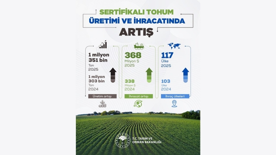 “Sertifikalı tohum üretimi ve ihracatında yükselişimizi sürdürüyoruz. 2025 yılı itibarıyla; 1 milyon 351 bin ton üretime ulaştık. 368 milyon dolar ihracat gerçekleştirdik. 117 ülkeye tohum ihraç ediyoruz. Tohumda yerli ve milli gücümüzü artırıyor, Türkiye'yi küresel ölçekte daha güçlü bir konuma taşıyoruz.”
