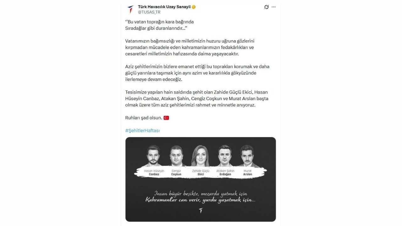 Açıklamada, şehitlerin isimleri tek tek anılarak fedakarlıklarının unutulmayacağı belirtildi. TUSAŞ, anma mesajında şehitlerin emanet ettiği değerlere sahip çıkma kararlılığını da yineledi.