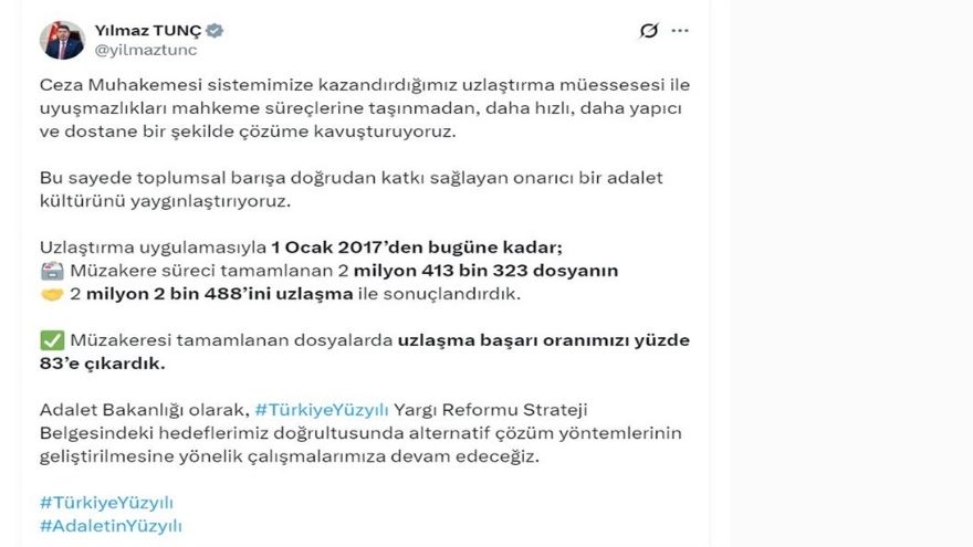 Adalet Bakanı Yılmaz Tunç, uzlaştırma uygulamasına ilişkin güncel istatistikleri sosyal medya hesabı üzerinden kamuoyuna duyurdu.