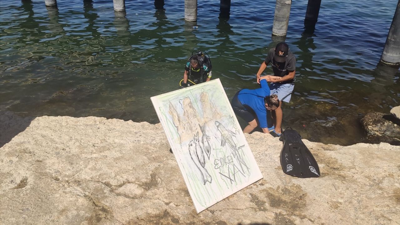 Edremit Belediyesinin açıklamasına göre, su altına dalış yaparak resim çizen ressam İlim, belediyenin düzenlediği etkinliğe katıldı.