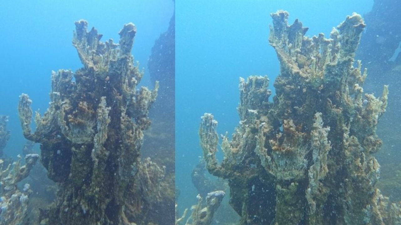 Diğerlerinden farklı olarak yatay bir formda gelişmiş olan yaklaşık 70 metre uzunluğundaki bu mikrobiyalit, dalış esnasında kayıt altına alındı.