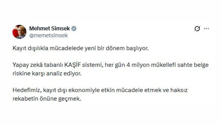 Hazine ve Maliye Bakanı Mehmet Şimşek, sanal medya hesabından yaptığı açıklamayla, kayıt dışı ekonomiyle mücadelede önemli bir adım atıldığını duyurdu. Şimşek, yapay zeka destekli KAŞİF sisteminin aktif olarak kullanıma alındığını belirtti.