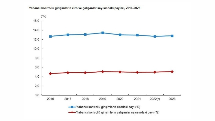 Bu işletmelerin ülke ekonomisindeki ciro payı da hafif bir artış gösterdi. 2022 yılında toplam cironun yüzde 12,7’sini oluşturan yabancı girişimler, 2023’te bu oranı yüzde 12,8’e taşıdı.