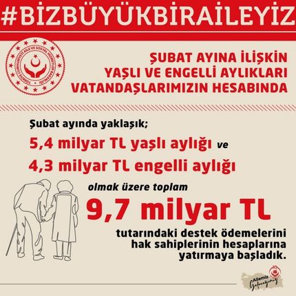 "Şubat ayı engelli aylıklarını, ocak ayı memur maaş katsayısındaki düzenleme sonrasında zamlı olarak ödeyeceğiz. Bu doğrultuda şubat ayı için yaklaşık 5,4 milyar lira yaşlı aylığı ve yaklaşık 4,3 milyar lira engelli aylığı olmak üzere 9,7 milyar lira tutarındaki yaşlı aylığı ve engelli aylıklarını hesaplara yatırmaya başladık. Ödemelerin tüm vatandaşlarımıza hayırlı olmasını diliyorum."