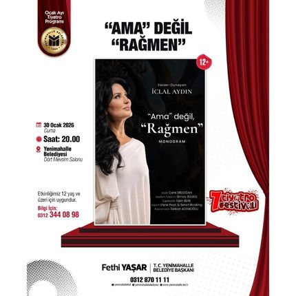 ‘’Yenimahalle 7. Tiyatro Festivali, 30 Ocak Cuma günü Belediyemizin Dört Mevsim Tiyatro Salonunda, değerli sanatçımız İclal Aydın'ın tek kişilik oyunu, "Ama Değil Rağmen" ile devam edecek.’’