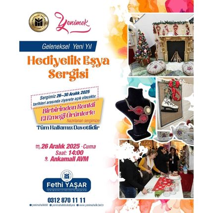 Yenimahalle Belediye Başkanı Fethi Yaşar, sosyal medya hesabından yaptığı paylaşımda, “Yenimahalle Belediyesi Meslek Edindirme ve Hobi Kursları (YENİMEK) kursiyerlerinin yıl boyunca binbir emekle hazırladığı ürünlerinin sergileneceği Geleneksel Yeni Yıl Hediyelik Eşya Sergisi’ne tüm vatandaşlarımız davetlidir” ifadelerini kullandı.