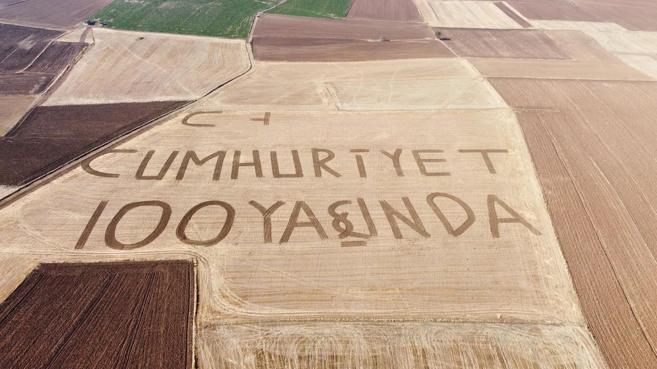 Yozgat'ın Sorgun ilçesinde bir çiftçi, Cumhuriyetimizin 100'üncü yılı için 72 dekarlık tarlasına "Cumhuriyet 100 yaşında" yazdı.